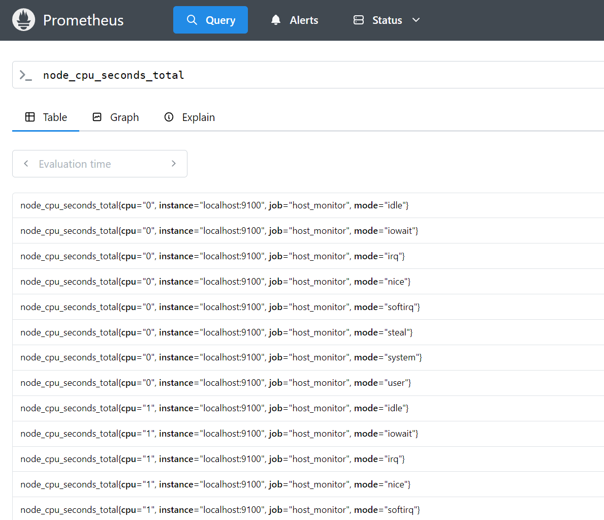 在首页页面中的检索框中使用node_cpu_seconds_total 进行检索。