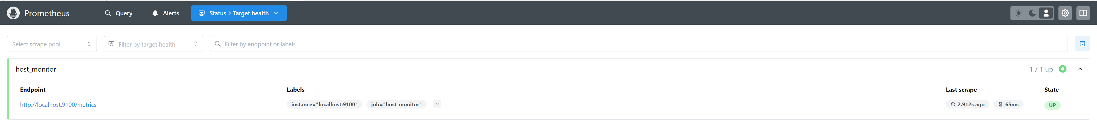 浏览器中输入 http://ip:9090在打开的浏览器页面的Statuc—Targets页面可以查看到host_monitor目标节点